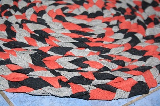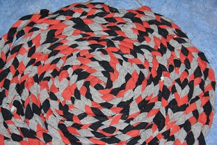 Con la «cuerda» rematada, pasamos a hacer la alfombra. Lo mejor es hacer este proceso en alguna mesa o en el suelo. Empezamos por el centro de la alfombra. Ponemos la «cuerda» y empezamos a enrollarla desde el centro, según vamos enrollándola la vamos cosiendo, con hilo y aguja, los bordes interiores y exteriores de las cuerdas según se van juntando.