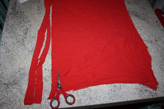 Primero cortamos la camiseta por debajo de las mangas en linea recta. Cuando tengamos esta parte, pasamos a cortar la camiseta en tiras de tres centímetros (más o menos) de ancho pero sin cortarlo hasta el final. Dejando unos cinco-seis centímetros al final del lateral. Una vez cortado toda la camiseta estiramos cada una de las tiras que hemos