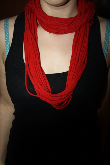 cortado, lo cual hará que se alarguen las tiras y estas se enrollen entre si dándole una forma circular. Continuamos juntando la «camiseta» por la parte que no está cortada y con un pedazo de tela extra hacemos un nudo y ya está lista para usar.