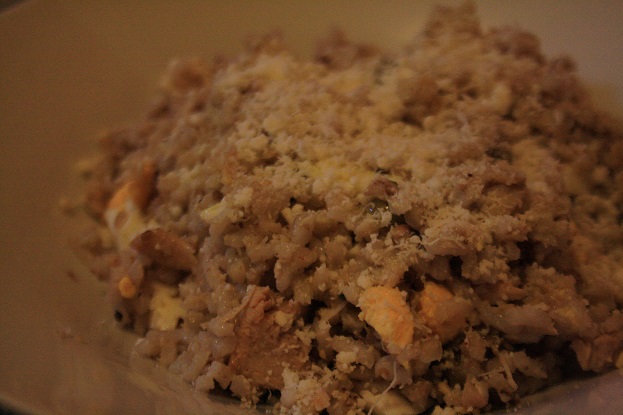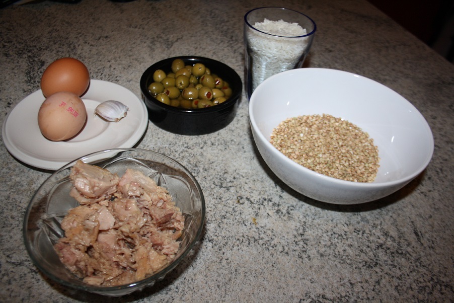 Una vez que el arroz está preparado junto con el trigo, lo sabremos porque el agua se habrá evaporado y estos estarán en su punto para comer, añadimos el huevo, el atún y las aceitunas. Mezclamos todo, y añadimos orégano y/o perejil al gusto.