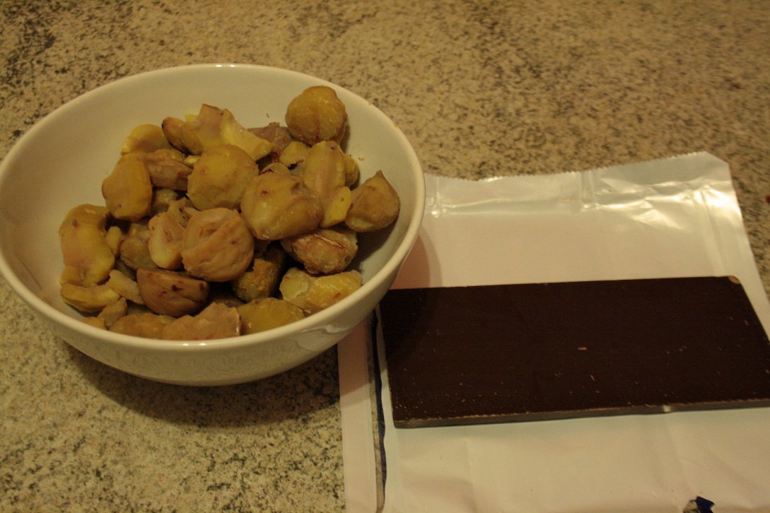 Los pasos a seguir son los siguientes: pelamos las castañas incluida la piel interior; los ponemos a cocer con leche hasta que queden blandas las castañas. Procurar hacer esto a fuego lento o la leche se os saldrá del cazo, ir añadiendo leche según sea necesario. Mientras las castañas se van cociendo, ponemos el chocolate a fundir, añadiéndole un poco de leche, para que no se nos pegue en el cazo y quede un poco más