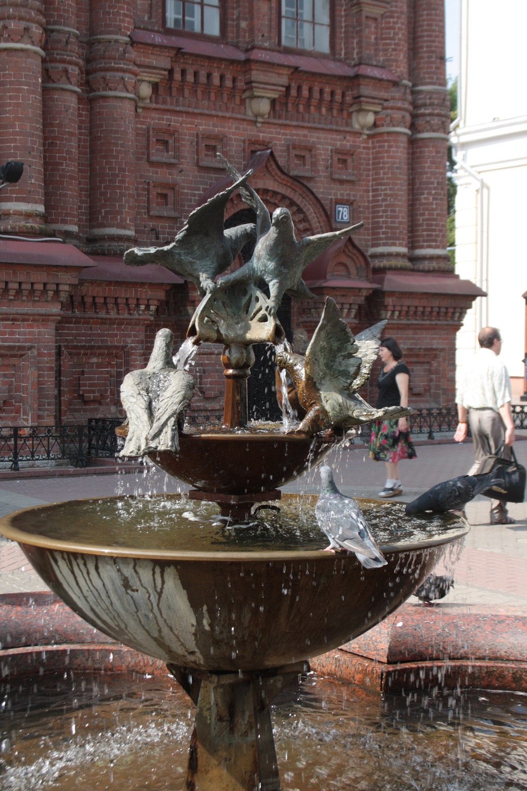 Diferenciando palomas de metal con vivas. Fuente en el centro de Kazan
