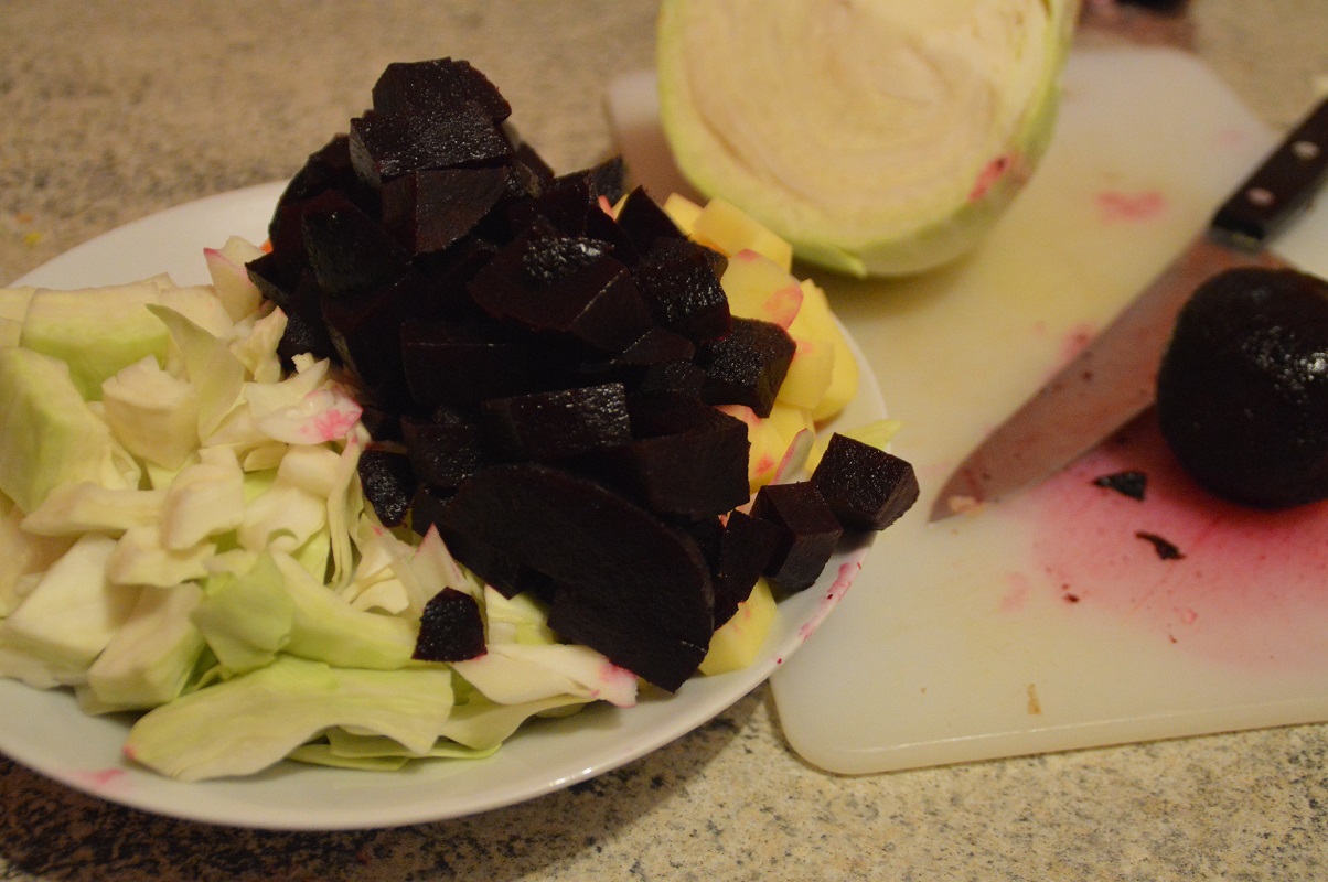 Cortamos todos los ingredientes en cubitos pequeños, aunque no muy pequeños, se tienen que ver los cachos y sentirlos al masticarlos. Ponemos el agua a hervir y cuando esta rompa en ebullición ponemos primero la remolacha, la cual tardará bastante en cocinarse, pasado unos 20 minutos ponemos el resto de las verduras, y lo dejamos cocer por una hora. Ojo si vais a usar carne de ternera o cerdo, lo mejor es hacer primero un caldo con la carne y la cebolla dejándolo por una hora cociendo y después añadir la remolacha y el resto de los ingredientes. Durante la cocción se irá formando una espumilla en la parte alta de la sopa, así que con un cazo iremos quitando esa espumilla que se forma.