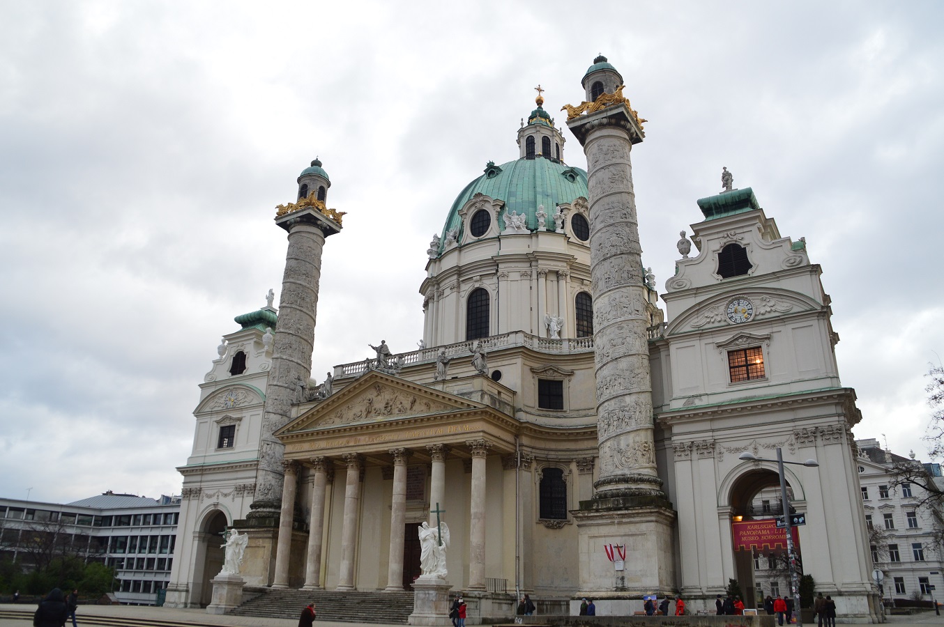 esperando, así pues fuimos a ver Hunderwasserhaus. Este edificio del arquitecto Hunderwasser, es uno de los más pintorescos de Viena, sólo tienes que pasarte por delante para ver el porqué, el edificio está habitado, así pues no es posible visitarlo por dentro, pero al lado del edificio se encuentra otro pequeño que te dará una idea de como puede ser vivir dentro del edificio. Desde estas curiosas casas, cogimos el tranvía número uno el cual circula alrededor del centro histórico y pasa por varios sitios de interés: la iglesia votiva, el ayuntamiento, el parlamento, el barrio de los museos, Hofburg, y muchos más, salimos en Karlsplatz donde se encuentra la iglesia de San Carlos Borromeo Karlskirche, y un edificio de oficinas curioso con un «superpájaro» en el lateral.