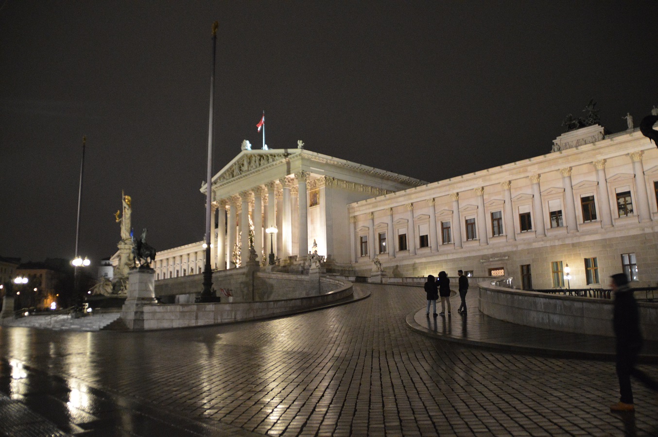 Pasado un rato teníamos la necesidad de movernos para poder bajar tanta comida, y volvimos sobre nuestro pasos hacia Heldenplatz para atravesar Hofburg, pasando por la biblioteca nacional, la escuela de equitación española, para desembocar sobre la plaza Michaelerplatz. En la cual se pueden ver restos romanos de la antigua «Viena». Seguimos por la calle Herrergasse, por donde pasamos cerca del palacio Harrach, con su cafe central y sus galerias, para acabar desembocando después detrás del Burgtheater, donde, enfrente del mismo, se encontraba el ayuntamiento, con su gran torre que parece más de una iglesia que la de un ayuntamiento. Para entonces estaba ya lloviendo y a pesar de que nos metimos en las galerías que están detrás del ayuntamiento, donde se encontraban varios restaurantes cafés y bares, que o bien por la hora, o por la época de vacaciones estaban cerrados, así que decidimos volver al hostal, pasando antes por el parlamento de estilo neoclásico con una estatua de Minerva/Ateneas enfrente del mismo.