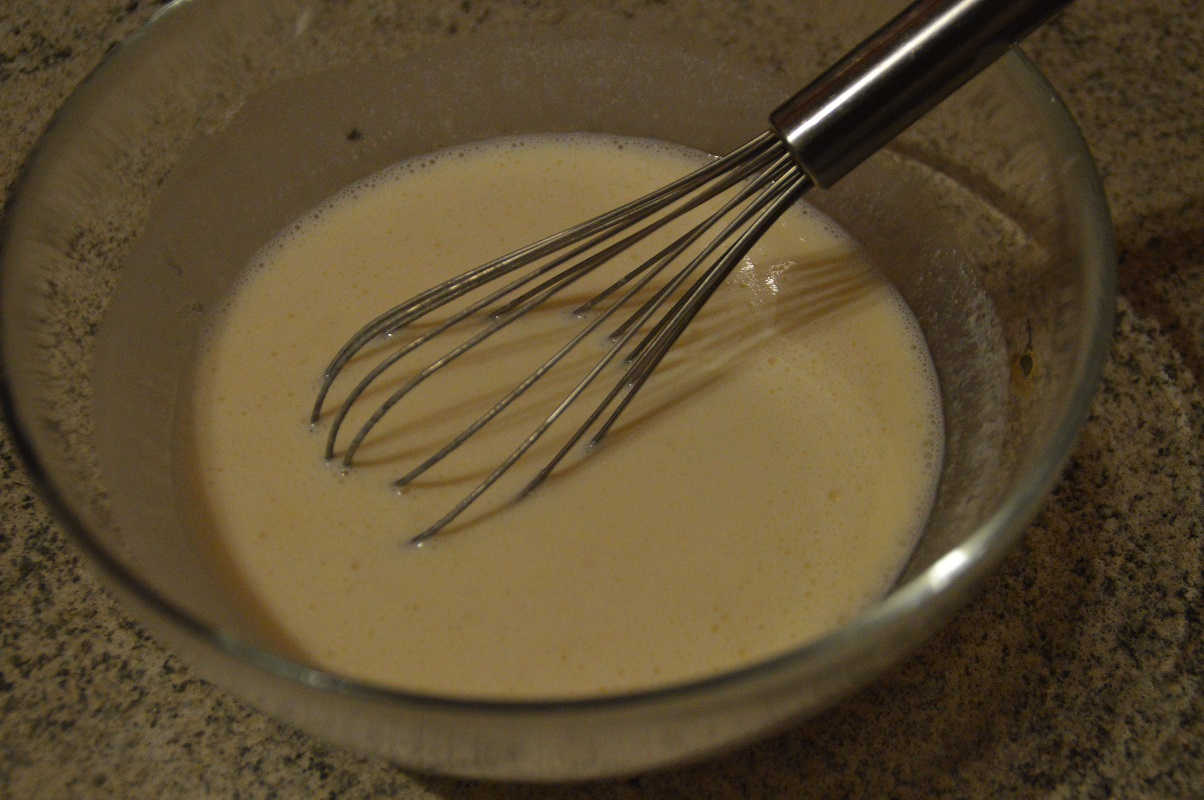 Empezamos preparando la masa para las filloas. Para eso cogeremos un vaso, para usarlo como medida, el cual lo llenaremos de harina y echaremos en un cuenco. Con el mismo vaso lo llenaremos de leche, la cual iremos vertiendo poco a poco en el cuenco, y añadiremos 1 vaso y medio de leche. Una vez que esté todo mezclado, batiremos un huevo, y lo echamos a la masa, mientras seguimos mezclando con la varilla.